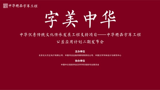 6月27日,由北京北大方正电子有限公司(以下简称“方正电子”)、中国书法出版传媒有限责任公司(以下简称“中国书法出版传媒”)、中国文字字体设计与研究中心主办,中国中文信息学会汉字字形信息专业委员会协办的“字美中华——中华精品字库工程公益应用计划二期发布会”在京召开。