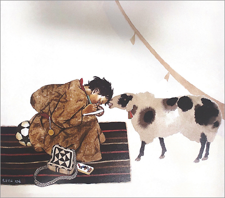 与此同时,随着内地艺术家进藏热潮的兴起,西藏主题绘画异军突起逐步成为中国美术史中重要的表现题材,几代艺术家在融合汉地工笔重彩和西藏本土艺术的基础上,借鉴吸收西方绘画元素,形成具有现代西藏本土绘画特色的新样式——西藏布面重彩艺术。西藏布面重彩创作以西藏本土文化为基础,表现西藏人民社会文化生活,画面具有浓厚的乡土气息和显著的民族特色。其在绘画语言上以工笔重彩为依托,形成“重彩”兼“淡彩”的巧妙融合,同时借鉴西藏民间美术和宗教美术的表现形式,既继承了唐卡作品细致精炼、用色浓艳的特点,又对其繁密的构图形式进行修改,以气韵生动的艺术追求取代严谨缜密的宗教秩序,更加强调艺术视觉冲击力和艺术家的自我感受,表现艺术家对西藏民族艺术观和宗教观的理解与体悟。通过韩书立创作的《高原祥云——和平解放西藏》《节日》《先写作业》等作品,我们对其特点可窥一斑,画面理性借鉴传统工笔绘画、碑帖拓片以及西藏唐卡、壁画的艺术表现形式,展现深沉之中极具古韵味的现代美感。